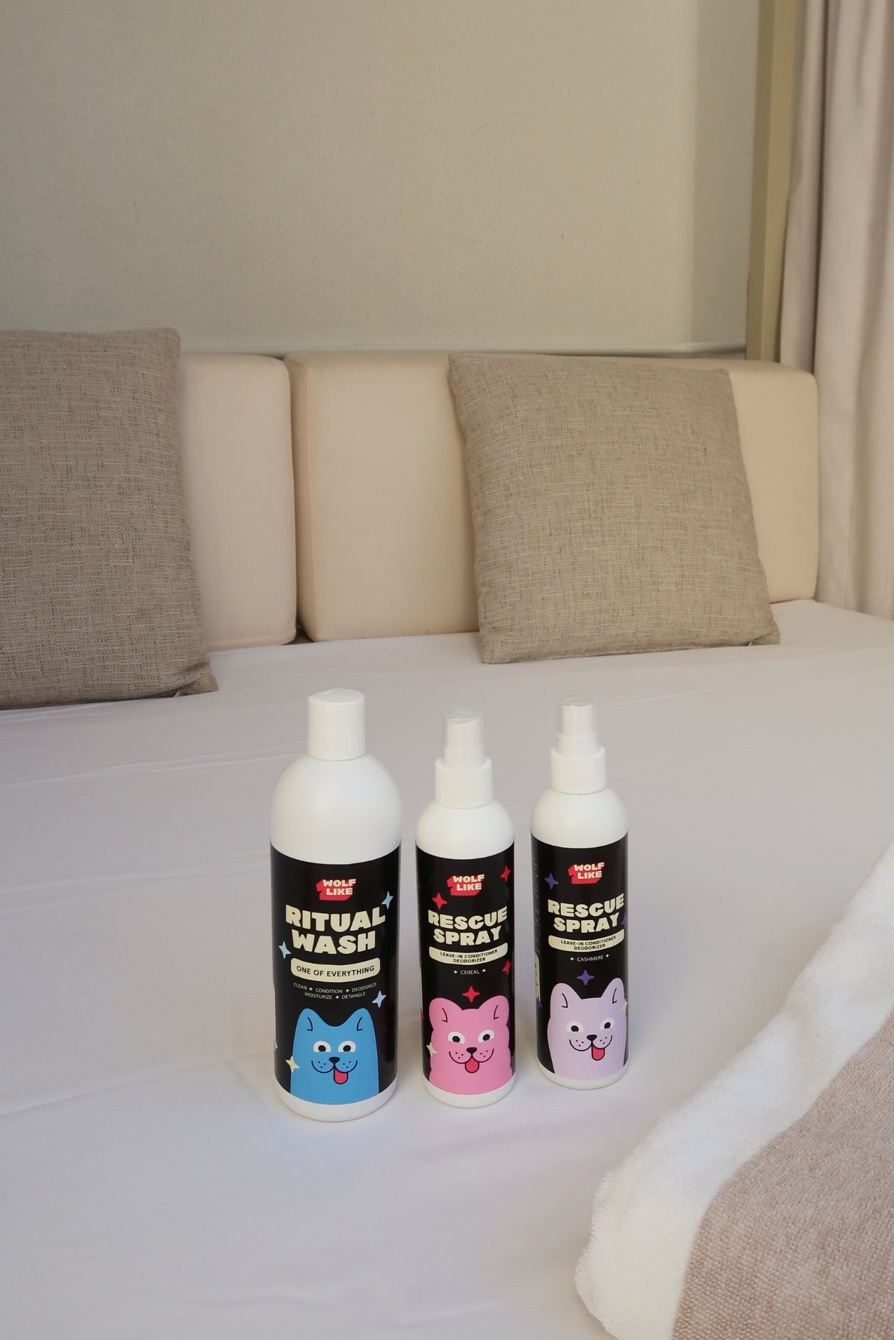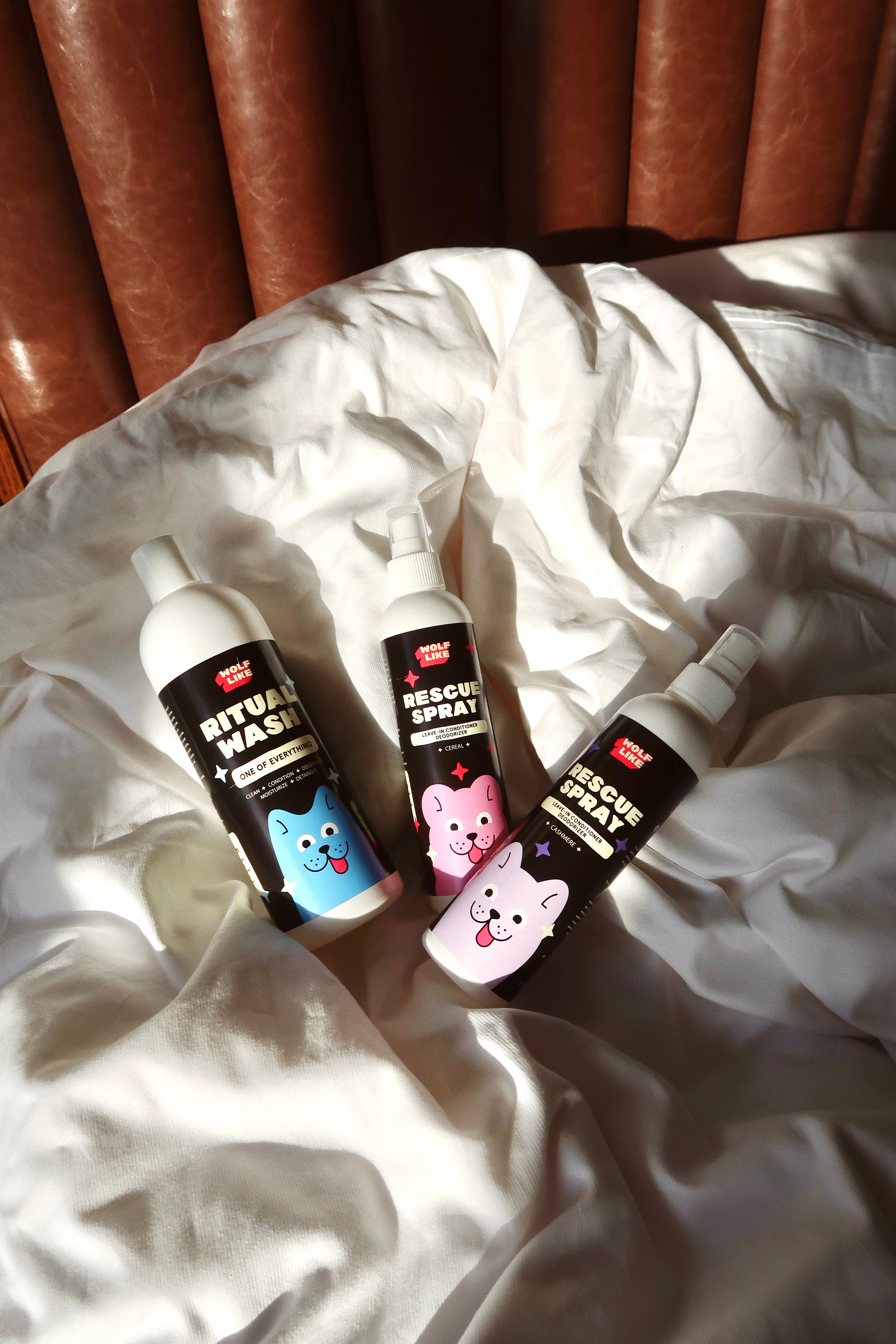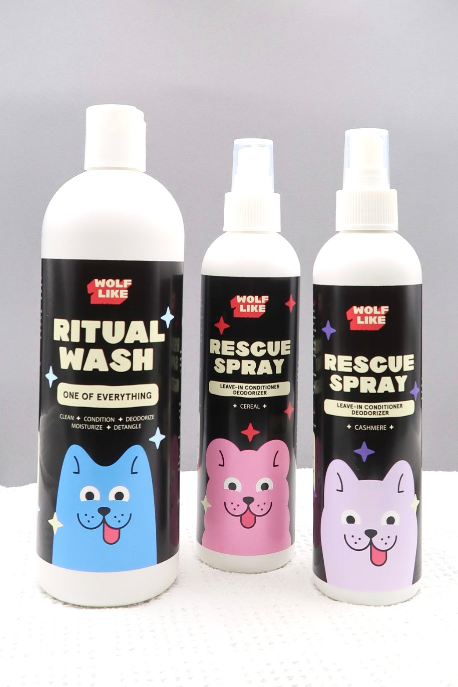Everything you need to keep odor and grime away fast, while boosting your dog's health. Wash and condition gently, condition coat, and remove odor fast with Wolflike's Best Selling Trio that includes Ritual Wash and Rescue Sprays in two delicious scents Cashmere and Cereal